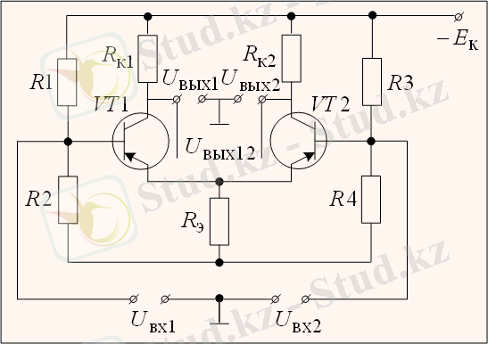 Екі кіріс екі транзистордың базасына беріледі. Шығыс кернеу коллектор тізбегіндегі көпірден алынады. Оң және теріс қорек көзінен қоректенеді.