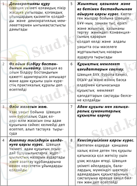 Швецияда адам құқықтарын қамтамасыз ету үшін күресте халықаралық саясат саласындағы сегіз салаға басымдылық беріледі: