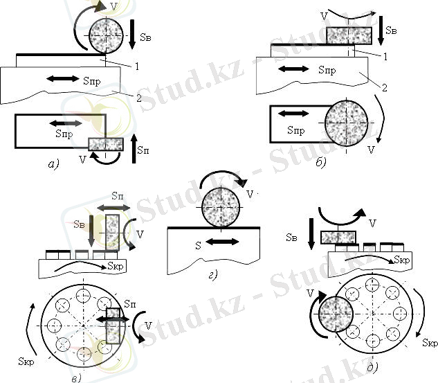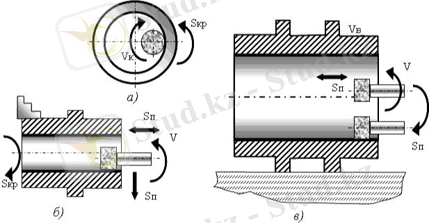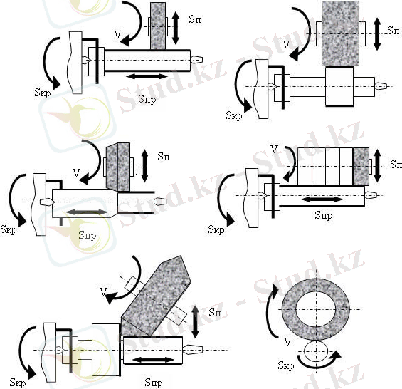 Бойлық беріспен ажарлау кезінде (4а-сурет) дайындама бір қалыпты айналады және қайтымды-ілгерлемелі қозғалыс жасайды. Дайындаманың ақыр жүрісінде ажарлағыш шарықтас Sп өлшемге орын ауыстырады, ал келесі жүріс кезінде белгіленген тереңдікпен металл қабатын кеседі. Ажарлау процессі дайындама бетінің керекті өлшемін алғанша жүргізіле береді. Егер дайындаманың екінші аумағын ажарлау керек болса, баптау және орнату жүргізіледі, жаңа жайда бойлық берісті ауыстыру үшін үстелдің үстіне таяныштар орнатады. Беттің керекті кедір бұдырлығына байланысты Sп, Sпр беріс өлшемдерін орнатады.