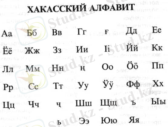 39 әріптен тұратын хакас алфавитінде ол орыс графикасы негізінде жасалған. Онда орыс алфавитінің барлық әріптері бар, сонымен қатар 6 дыбыс өзіндік дыбыстарға енгізілген: