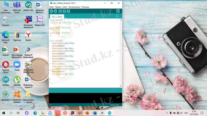 Қысқаша қорытынды: Arduino - бір микросхемада орындалған, микропроцессор, жады және әр түрлі перифериялық құрылғылардан тұратын Atmega отбаының микроконтроллері болып табылады. Светодиод - тікелей бағытта электр тогын өткізу кезінде оптикалық сәуле шығаратын электрондық аспап болып табылады. Әрбір светодиод резистор арқылы Arduino-ның бөлек шығысына қосылған. Қызыл - 2 шығысына, сары - 3 шығысына, Жасыл - 4 шығысына қосылған. Егер 2-ші шығысқа "1" сигналын берсе, онда қызыл жарық диоды жанады, 3 болса - сары, 4 болса - жасыл болады.