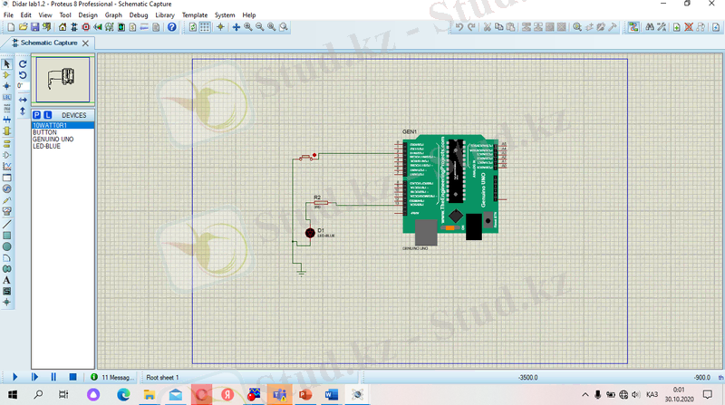 Жұмыс мақсаты: Proteus бағдарламасында схемаларды құрастыру дағдыларын меңгеру, сондай-ақ Arduino микроконтроллері үшін бағдаршам оттарын басқару және батырма күйін сұрау бойынша кодтар жасауды үйрену.