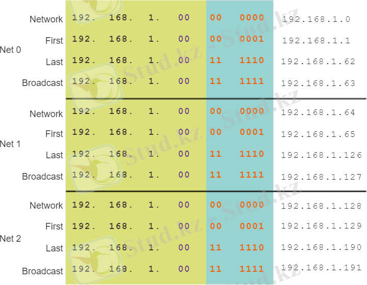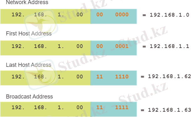 Есіңізде болсын, мекен-жайдың хост бөлігіндегі барлық 0 биттері желілік адрес, ал хост бөлігіндегі барлық 1-лер - таратылатын адрес. Сондықтан әр ішкі желі үшін тек 62 хост мекен-жайы бар.