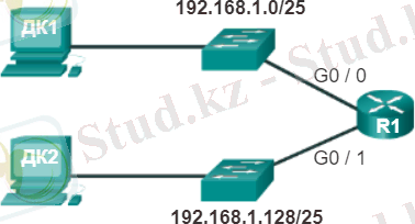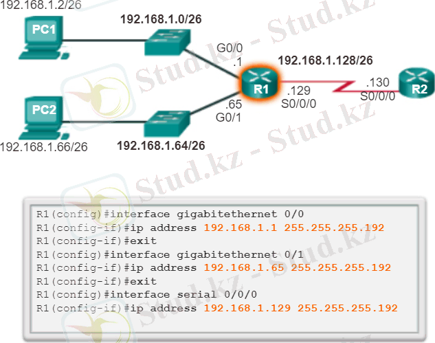 PC1 (192. 168. 1. 2/26) 192. 168. 1. 1 (R1 интерфейсінің мекен-жайы) әдепкі шлюз адресі ретінде қолданады