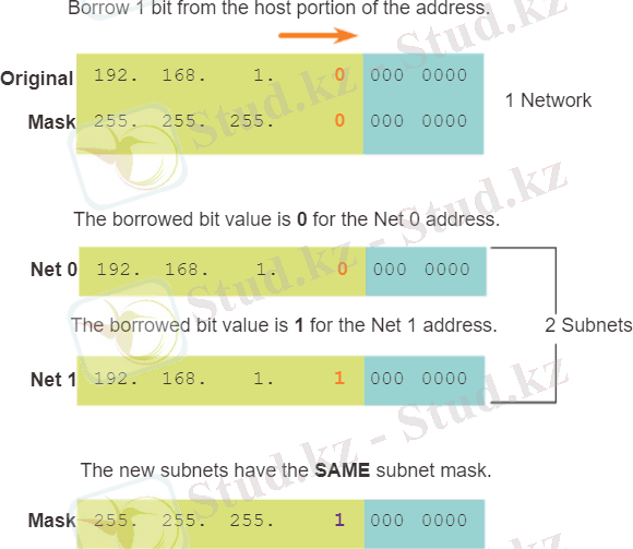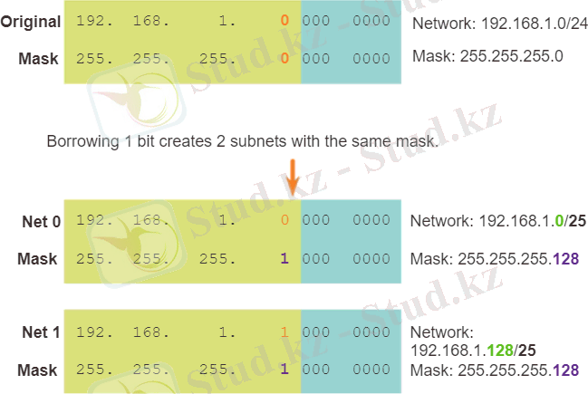 2-суретте 1 бит хост түйісіндегі ең маңызды биттен (сол жақ биттен) алынған, осылайша желілік бөлік 25 битке дейін кеңейтілген. Бұл бірінші желі үшін алынған битте 0 және екінші желі үшін алынған битте 1 қолдану арқылы анықталған 2 ішкі желі жасайды. Екі желіге арналған ішкі желі маскасы биттің алынған күйінде 1-ді қолдана отырып, осы биттің қазір желі бөлігінің бөлігі екенін көрсетеді.