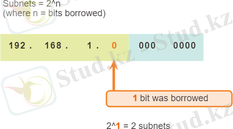 Сол 192. 168. 1. 0/24 мекенжай блогын қолданып, кем дегенде 3 ішкі желі құру үшін хост биттерін алу керек. Бір битке қарыз алу тек 2 ішкі желіні қамтамасыз етеді. Қосымша желілерді қамтамасыз ету үшін көбірек хост биттерін алу керек. 2 ^ формуланы пайдаланып 2 бит алынған болса, жасалған ішкі желілер санын есептеңіз: алынған биттер саны: