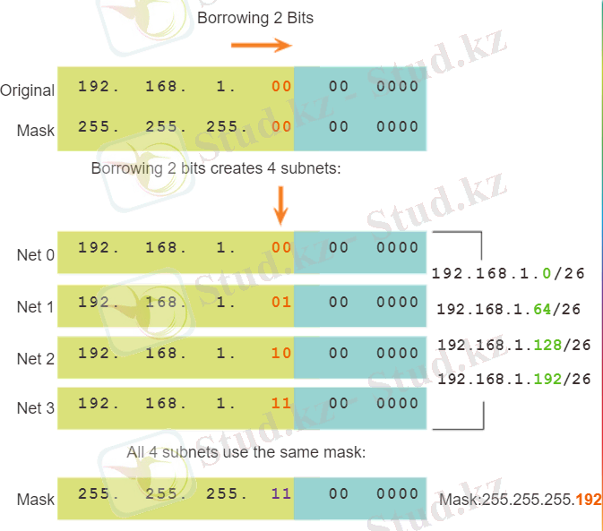 Еске сала кетейік, ішкі бит маскасы алынған биттерді көрсету үшін өзгеруі керек. Бұл мысалда, 2 бит алынған кезде, маска соңғы октетке 2 бит ұзартылды. Ондық бөлшекте маска 255. 255. 255. 192 түрінде ұсынылған, өйткені соңғы сегіздік екілік санау арқылы 1100 құрайды.