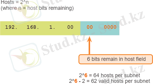 Хосттар санын есептеу үшін соңғы октетті зерттеңіз. Ішкі желі үшін 2 бит алғаннан кейін, 6 хост бит қалады.