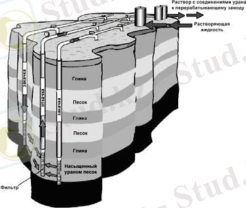 Уран өндірісінде түзілетін қалдықтар. Қазіргі уран алу технологиясы бұрынғы шахты арқылы, немесе ашық әдіспен алудан мүлдем ерекшеленеді. Қазіргі күні ұзын саны 21 ден асатын кеніштерден алынатын уран шикізаты негізінен жер астындағы кені бар жерді бұрғылау арқылы ұңғылар жасалынып, одан кейін кенді қабатқа күкірт қышқылын айдау арқылы кен ерітіледі. Одан соң күшті қышқылды ортада еріген уран мен басқа ілеспе металлдар ерітіндісін жоғарыға арнаулы сораптармен сорып шығарылып, бұл ерітінділер арнаулы ыдыстарға құйылып, одан кейін оны байыту, бөлу және тазалау зауыттарына жібереді. Қазір көптеген кен орындарында байыту мен тазалауды ұйымдастыру үшін арнаулы технологиялық қондырғылар орнатылған. Бұл әдісті алғаш рет Кеңес үкіметі кезінде, яғни 20 ғасырдың жетпісінші жылдары Басқармасы Ташкентте орналасқан «Краснохолмскі» экспедициясы Өзбекстан-дағы «Үшқұдық» уран кенішінде қолданған. Бұл әдіс уран кендерін шахтылардан қазып алуға қарағанда әлдеқайда қауіпсіз, құмды - шөлейтті аймақтарда суды да үнемдейді, әрі кенші - оператор жоғарғы радиоактивті кендермен және оны өндіру кезінде пайда болатын асқан зиянды радиоактивті шаңдармен тікелей байланысқа түспей, жердің бетіндегі технологиялық қондырғыларда арнаулы басқару тетіктері арқылы процесстерді басқарып отырады.