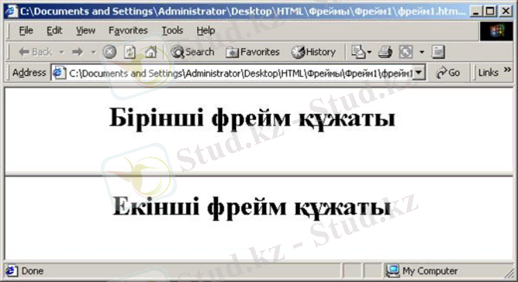 Мұндағы екі фрейм жолдар (rows) бойынша көлденеңнен бірінің астына бірі орналасады, олар экранды 50 %-дан бөліп алады. Үстіңгі фреймде "1 файл. htm" құжаты ашылады да, төменгісінде - "2 файл. htm" орналасады (4 сурет) .