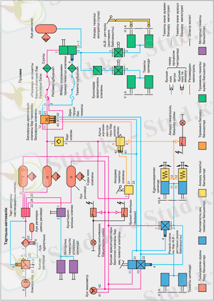 2-сурет. Тартқыш жүк автокөлігінің екі контурлы - екі магистральді пневматикалық тежеу жүйесі
