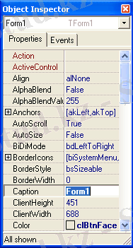 Бұл терезе объекттер инспекторы болып, мұнда объекттің негізгі параметрлері енгізіледі. Уақиғалар тізімі жазылады. Мұны View/obgect inspector немесе F1клавиші арқылы экранға шығамыз. Obgect inspector терезесі екі жапсырмада тұрады.
