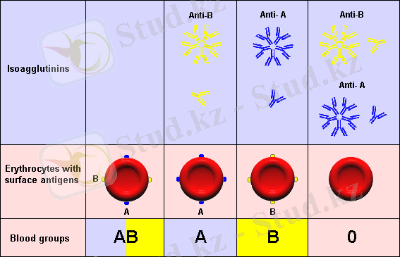 Эритроциттердегі кейбір антигендік қасиеттердің жалпылығы бойынша барлық адамдар белгілі қан тобына тиістілік бойынша бөлінеді. Әр адамның қан тобы ерекше. Белгілі қан тобына тиістілік адамның тууынан бойына бітіп, өмір бойы өзгермейді. Қан «AB0» жүйесі бойынша төрт топқа «резус факҚанның құрамы өте күрделі. Қан пішінді элементтер, яғни қан клеткаларынан және сұйық плазмадан тұрады. Қанның пішінді элементтеріне қанның қызыл клеткалары эритроциттер, ақ клеткалары лейкоциттер және қызыл пластинкалары тромбоциттер жатады. . Қанның бұл клеткалары күллі қанның 55-60%-ын, ал плазма 40-45%-ын құрамына. Қан плазмасының құрамы да күрделі: оның 90%-ға жуығы су, 7-8 % белоктар, 2 % түрлі органикалық және бейорганикалық заттар. Оның құрамында белок 0, 3-0, 6%, май және липидтер 0, 1%, 120 мг/% глюкоза қанты, 0, 9% көмірсутегі, минерал заттар - натрий, калий, кальций, хлор тұздары, амин қышқылдары мен полипептидтер 4-10 мг%, мочевина 10-25 мг%, түрлі ферменттер, гормондар, түрлі витаминдер, холестерин заттар болады. Плазманың белоктарының негізгілеріне альбуминдер 4, 5%, а, (3, углобулиндер 2-3 %, фибриногендер 0, 2-0, 3 % жатады.