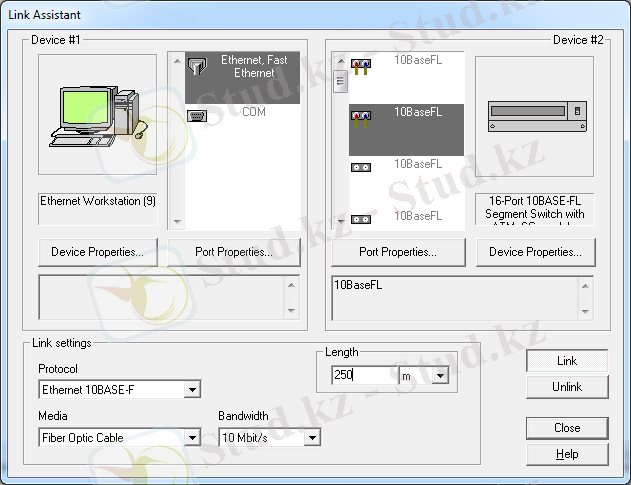 Ашылған жалғау терезесінде Link батырмасын басу арқылы жалғаймыз, кабель ұзындығын 250 метр деп еңгіземіз және басқа есептеу машиналарды осылай жалғап шығатын боламыз.