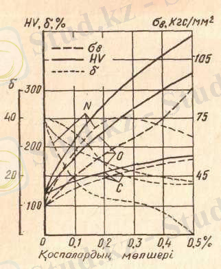 - 2-сурет. Титанның механикалық қасиеттерінің азот, оттек және көміртек қоспаларының мөлшеріне байланысты өзгеруі.