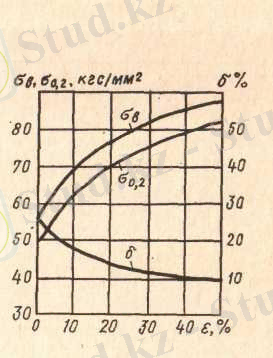 - 3-сурет. Титанның механикалық қасиеттерінің пластикалық деформация дәрежісіне байланысты өзгеруі.