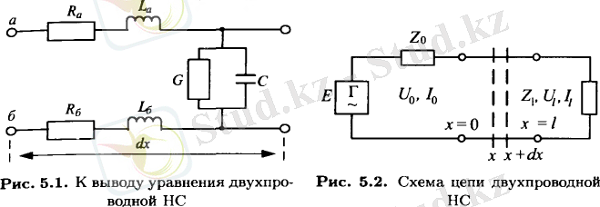 Екі сымды HC әртүрлі конструкцияға ие. Ең көп тарағандары симметриялы тізбектер, коаксиалды тізбектер және микрожолақты тізбектері. Бұл екі сымды НС толқын ұзындығының жиілік диапазонында қолданылады, егер сигналдың ең жоғары таралу жиілігінің толқын ұзындығы (берілетін) НС конструкцияларының көлденең өлшемдерінен әлдеқайда үлкен болса. Екі сымды НС үшін осы шарттарды орындау кезінде тек квази-толқындар таралады. Квазистационарлық режимде электромагниттік өрістің толқындық теңдеулері электромагностатика теңдеулеріне айналады және Ом және Киргоф заңдарының көмегімен шешіледі. Бұл жағдайда екі сымды НС-дегі кернеу мен токтың өзгеруін сипаттайтын теңдеулерді алу үшін сіз балама схеманы қолдана аласыз. 5. 1 сурет, мұндағы және жалпы қарсылық және индуктивтілік, ал G мен C - екі сымды НС dx учаскесінің өткізгіштігі мен сыйымдылығы. R, L, G, C параметрлері екі сымды HC берудің бастапқы параметрлері деп аталады. Р және L берілістерінің бастапқы параметрлері гармоникалық сигнал үшін болатын жалпы қарсылықты құрайды және ол тең болады. G және C беру параметрлері гармоникалық сигнал үшін тең болатын тізбектің жалпы өткізгіштігін құрайды және ол мынаған тең. Берілістің көрсетілген төрт бастапқы параметрлерінің ішінен тек R және G энергия шығынын анықтайды: біріншісі - өткізгіштерде және екі сымды NS айналасындағы басқа металл бөліктерде жылу шығыны; екіншісі - оқшаулаудағы шығындар.