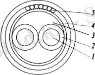 Рис. 3. 12. Конструкция однопарного кабеля КАЦП-2хО, 9: 1 - медная токопроводящая жила; 2 - изоляция (сплошная или трехслойная пленко-пористо-пленочная полиэтиленовая) ; 3 -сердечник (с гидрофобным заполнителем или сухим вод ©блокирующим материалом) ; 4 - экран (алюмополимерная лента) ; 5 - защитные покровы (оплетка стальными проволоками или стальная лента)