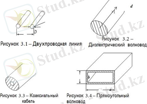 Мысал ретінде күріш. 3. 1. екі сымды сызық суретте көрсетілген. 3. 2. - диэлектрлік толқынөткізгіш, суретте. 3. 3. - коаксиалды толқын (коаксиалды кабель), ал суретте. 3. 4. - тік бұрышты толқын.