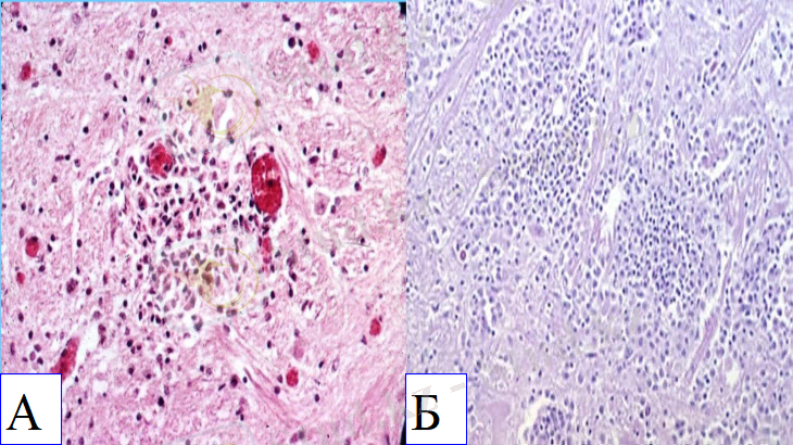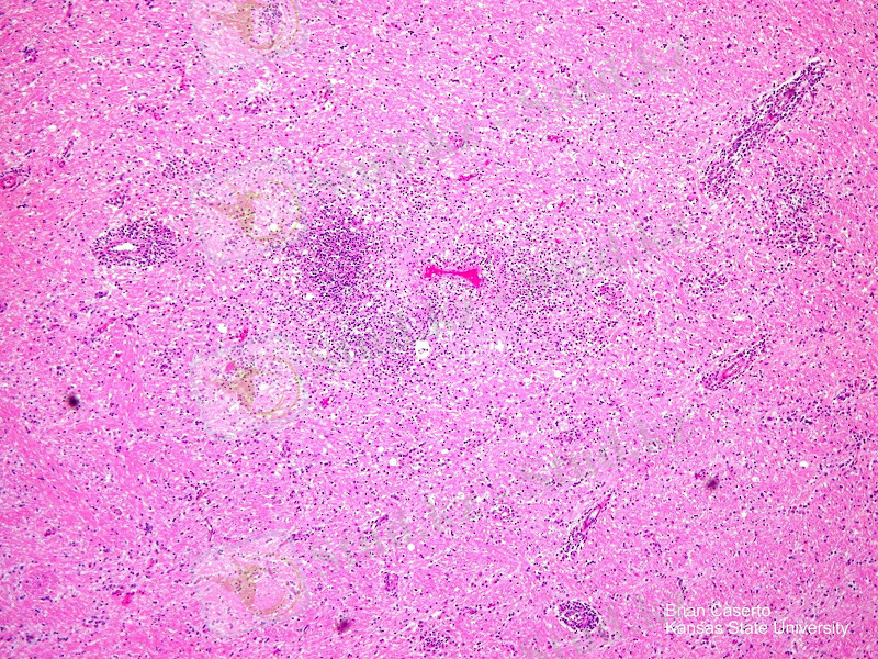 Мида лейкоциттер мен гистиоциттердің шоғырланған, жайылған және қан тамырларын тікелей қоршаған шоғырлары байқалады. Қабыну процесі ми затындағы лейкоциттердің шоғырларымен басталады да, кейін микроглия көбейіп, гистиоциттер пайда болып полиморфты сипат алады. [2]