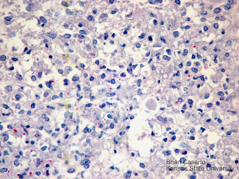 Иммуногистохимия (ми) : қызыл түсті ошақтар оң нәтижелі боялған Listeria monocytogenes