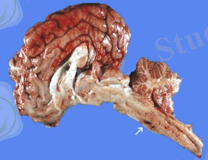 Ми заты мен ми қабықтарының домбығу сұйығымен кеуленгені, онда нүктелі және дақты қанталаулар, ми тамырларының қанмен молайғаны байқалады. Ми қабықтарында қанталау гематома түрінде болуы, ми діңгегінің каудальды бөлігінде жұмсару ошақтары болуы мүмкін. Кейбір деректер бойынша (М. М. Халимбеков), қойда бұл қанталаулар жайылма сипатта да болады, мидың қарыншалары мен қатты қабығы астында ірің тәріздес сұйықтың болуы ықтимал. [1]