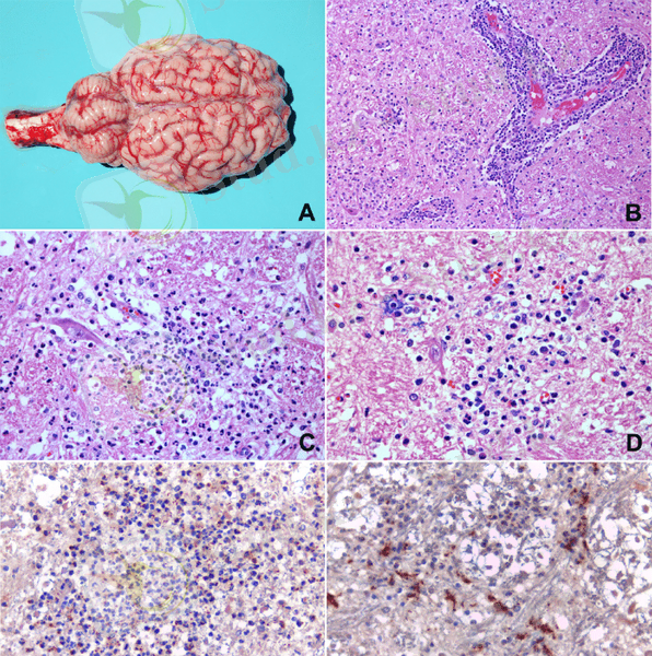 Жіті іріңді менингоэнцефаломиелит сопақша мидың, ми көпірінің, ортаңғы ми мен жұлынның бет бөлімінің алдыңғы бөлігінің, мишықтың, көру төмпектерінің зақымдалуымен сипатталады. Бұл мүшелердің ми заты мен ми қабықтарында жіті қабынған гиперемия және домбығу, сондай-ақ нүктелі және дақты қанталаулар, жұмсарған өлі ошақтар мен жұмсақ ұлпаның абсцессін көреміз. Жас төлдерде панэнцефалит пен отит байқалады. Жүйкелік-көздік формасында кератоконъюнктивит ажыратылады. [3]