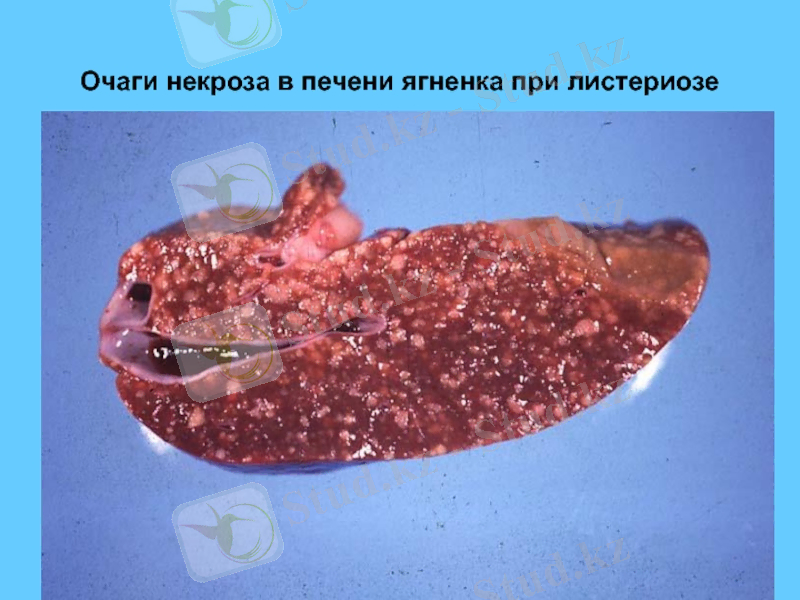 2) Сепсистік листериоз құстар, лақтар, қозылар мен ересек бұзауларда байқалады. Сепсистік листериоз бауырда, сирегірек лимфалық түйіндерде, талақта, өкпеде, жүрек (миокард) пен бүйректе өлі ошақтар пайда болуымен сипатталады. Кейін өлі ошақтар орнында гранулемалар қалыптасады.