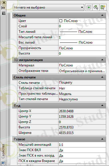 Егер әртүрлі типтерге жататын объектілер таңдалатын болса, терезеде тек жалпы қасиеттер көрсетіледі. Төмендегі суретте бірде-бір объект таңдалмаған.