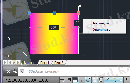 «Прямоугольник» командасы көмегімен төртбұрыш объектісін тұрғызу. Объектіге «Градиенттік заливка» операциясын қолдану. Төртбұрыштың екі жақ қабырғасының өлшемін орнату (5 сурет) .