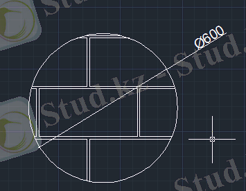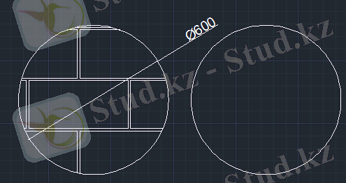 «Круг» командасы көмегімен диагоналі 600 бірлікке тең шеңберді тұрғызу. Шеңбер объектісіне үшкен масштабты «Штриховка» командасын қолдану. «Копировать» командасын таңдау. Командалық жолда «Выберите объект» сөзінен кейін шеңберді тышқанның сол жақ батырмасын шертіп, белгілеу. Объектіні көшіру. Нәтижесі суретте көрсетілген. Назар аударыңыз: объектінің қасиеттері көшірілмейді (штрихтау және өлшемі) .
