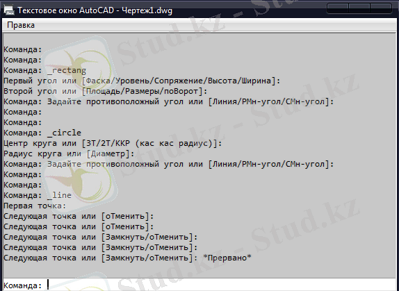 Командалар жолы (Командная строка)Командалық жолда AutoCad-тың басқару командалары, олардың параметрлері енгізіледі және операцияны орындау жөніндегі ақпарат көрсетіледі.