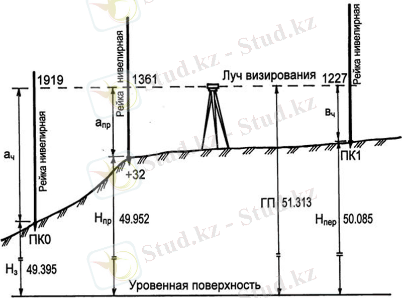 Егер рейканы аралықтағы бір нүктеге (D) қойып, одан d есептеуін алатын болсақонда оның биіктігі яғни кез келген нүктенің биіктік белгісінің мәні аспаптың горизонтымен осы нүктеге қойылған рейкадан алынған есептеудің айырымына тең.