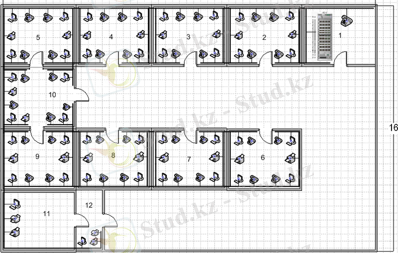 Тапсырма бойынша, кәсіпорынның құрылымдық кабельдік жүйесін құрастыру. Берілгені: Бөлме, сондай-ақ кәсіпорында пайдалануға арналған жабдық: №1-9 бөлімдері үшін 4 компьютерден, 10 телефоннан, 2 жүйелік принтерден. Бастық және хатшы кабинеттері үшін 1 факстан, 1 компьютерден, 1 принтерден. Серверлік бөлме үшін-желілік жабдықтар, серверлік сөре және шағын-АТС.