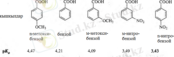 Аниондағы теріс зарядтың делокализациясына ықпал ететін хош иісті ядроның мета - және пара -позицияларындағы Электрон-акцепторлы алмастырғыштар қышқылдықты арттырады. Парапозитивтегі электронодонорлы алмастырғыштар керісінше әсер етеді.
