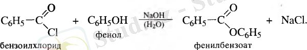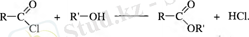 б) карбон қышқылдарының хлорангидридтерімен спирттер мен фенолдарды ацилдеу. Көбінесе бұл реакция шығарылған HCl бейтараптандыру үшін негіздердің қатысуымен жүзеге асырылады.