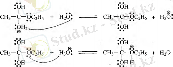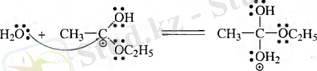 2 кезең- тетраэдрлік аддуктың протондалған формасын түзе отырып, протондалған эфир молекуласына судың нуклеофильді қосылуы:
