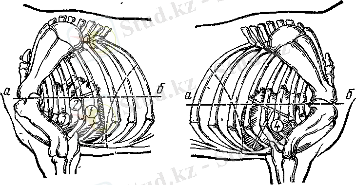 32-сурет. Жылқының жүрек тондарының сол және оң жағынан жақсы естілу орындары: 1-сол жақ атриовентрикулярлық тесік; 2- аорта тесігі; 3-өкпе артериясының тесігі; 4-оң жақ атриовентрикулярлық тесік; а-б-иық буынының сызығы.