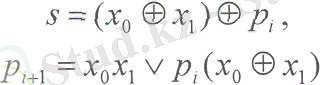 Толық бірразрядты екілік сумматор, екі қосынды санның біратаулы разрядтары берілетін үш кіріс арқылы, және екі шығыс: біреуінде арифметикалық сумма берілген разрядта іске асады, екіншісінде- келесіге (үлкенірек разрядқа) ауысу арқылы сипатталады. Жартылай сумматор арқылы іске асатын х 0 , x 1 - қосындылардың біратаулы разряды, s - тасымалды ескеретін x 1 және x 2 қосынды саны, p i - алдыңғы разрядтан ауысу, p i+1 - жоғарғы разрядқа ауысу біратаулы разряды болатын логикалық функциясы мынадай түрге енеді: