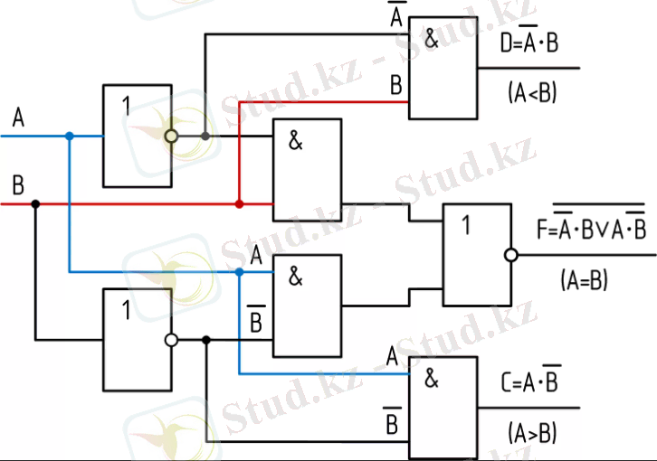 Тапсырма: цифрлық компаратор құру (үлгі ретінде бірразрядты цифрлық компаратор схемасын қойдым, осы схеманы құруға болады, не болмаса басқа типін алсаңыздар болады) .