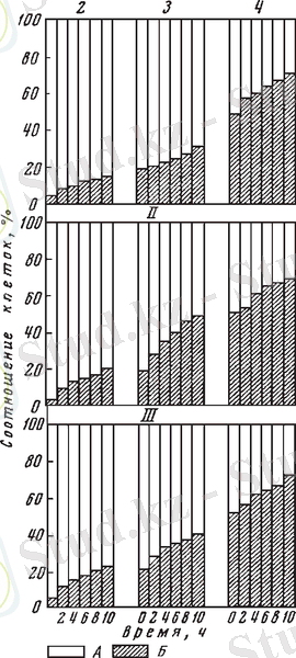 Сур. 1. Сахаромицеттер (А) мен ашытқы тәрізді саңырауқұлақтар (Б) арақатынасының бірлескен мәдениетте өзгеруі, олардың тұқым материалындағы мөлшері әртүрлі: I-сахаромицеттердің бірлескен мәдениеті және Mycoderma а. ; II-сахаромицеттер мен C. utilis бірлескен мәдениеті; III-сахаромицеттер мен C. krusei бірлескен мәдениеті; 1-Бақылау (сахаромицеттердің таза мәдениеті) ; 2-95% сахаромицеттер; + 5% ашытқы тәрізді саңырауқұлақтар; 3 - 80 % сахаромицетов; + 20% ашытқы тәрізді саңырауқұлақтар; 4 - 50% сахаромицеттер; + 50% ашытқы тәріздес саңырауқұлақтар.