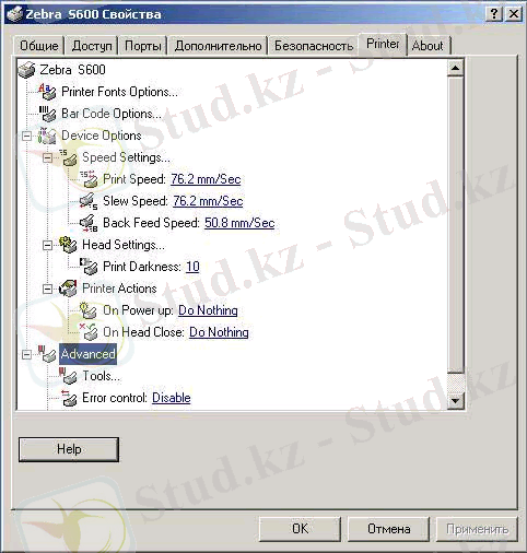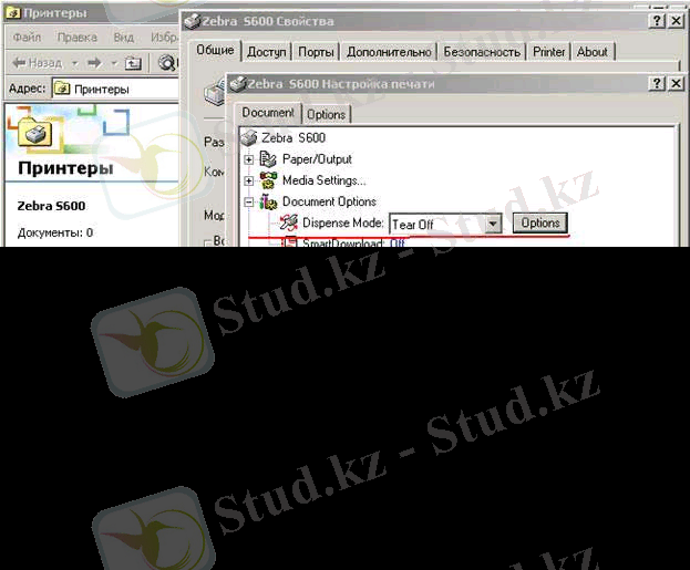ZEBRA S600 принтерінің қасиеттер терезесінде (ПУСК->Настройка->Принтеры) төменде көрсетілген параметрлерді орнату (сурет 7) :