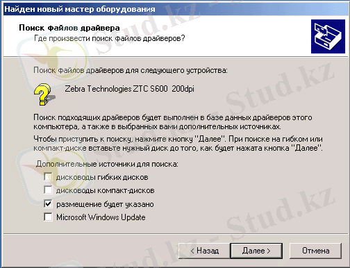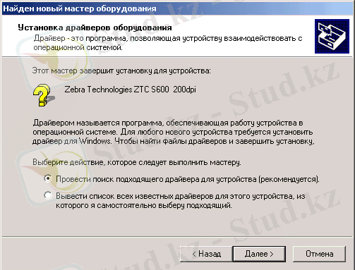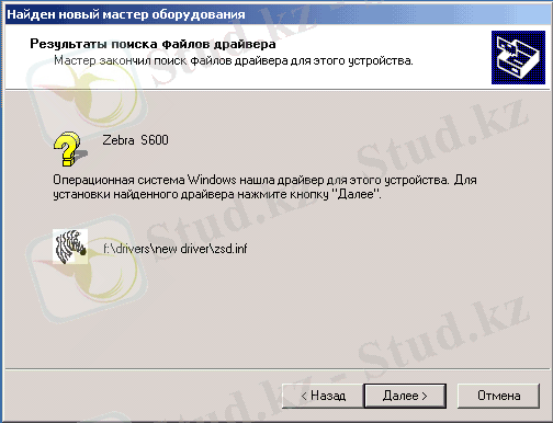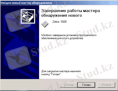 ZEBRA S600 принтерін орнату үшін принтерді міндетті түрде компьютердің LPT портына қосып, принтермен бірге жинақта болатын драйверлері бар дискті CD-ROM тесігіне салу қажет. Операциялық жүйе Zebra Technologies ZTC S600 200 dpi құрылғысы табылғаны туралы хабарлама береді (сурет 1) :