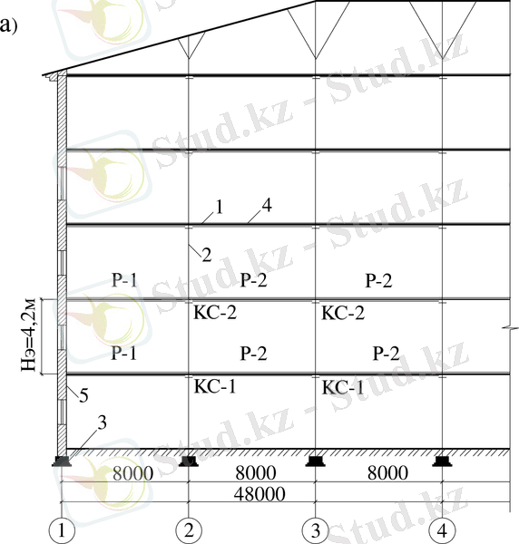 1-тіреуіш, 2-баған, 3-іргетас, 4-еден плиталары, 5-кірпіш қабырға