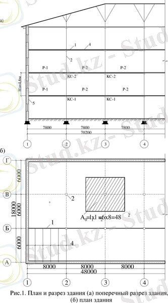 1кВ. М. жүктеме негізінде. еден алаңы (кесте. 1) l_1=5, 4 м бағандарының қадамы кезінде 1P. m-ге есептелген жүктемені есептейміз