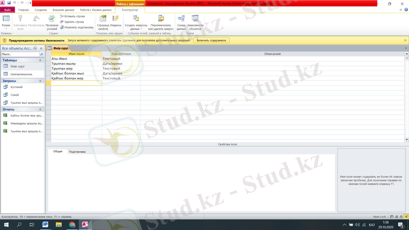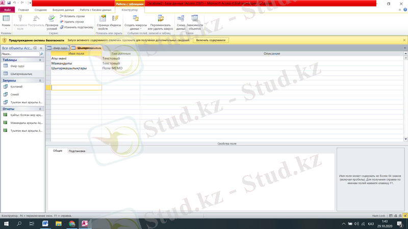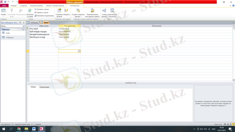 MS Access- те кесте құрудың 3 тәсілі бар: кесте шебері көмегімен, кесте режимінде, конструктор режимінде.