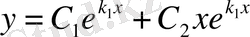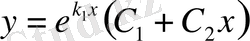 - (3) теңдеудің түбірлері өз ара тең нақты сандар:. Бұл жағдайда бір дербес шешімдіал екіншісінтүрінде аламыз. у1жәнеу2шешімдері сызықты тәуелсіз, себебі. Сондықтан 3-теорема бойынша (2) теңдеудің жалпы шешімі