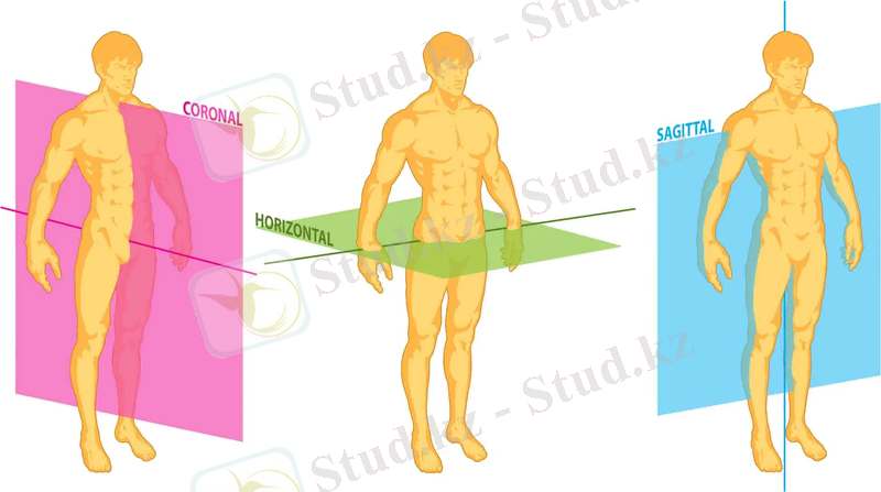Дененің кеңістіктегі орнын, оның бөліктерінің бір-біріне қатысты орналасуын анатомияда көрсету үшін жазықтықтар мен осьтер ұғымдары қолданылады. Адам тұрғанда, аяқтары бірге, алақандары алға қараған кезде дененің бастапқы қалпын қарастыру әдетке айналған. Адам денесі арқылы шартты түрде үш жазықтық тартылады: көлденең, сагиттальды және фронтальды (1. 1-сурет) .