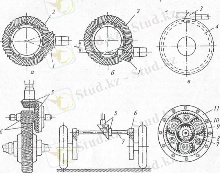 Конусты немесе гипойдты тісті доңғалағы бар одинарлы басты берілістер (4. 7. Сур) кеңінен таралған. Одинарлы басты берілістің беріліс саны 5 . . . 3 . . . 6 аралығында жатады. Ары қарай беріліс санының ұлғары жетеленуші тісті доңғалақтың диаметрінің ұлғарына әкеледі, бұл өз кезегінде термо-өңдеуді қиындатады және дорожный просвет төмендетеді. Шеңбер доғасы бойынша жасалатын конусты берілістердің тісті доңғалақтары қисық тісті (глисон, элоид, эрликон немесе эвольвента, клингельнберг типінде) . Мұндай берілістерлің артықшылығы: тістер доңғалағының өзара орналасуының дәлсіздігіне сезімталдығы аз және тістерді жоғары өнімділіктегі жабдықта өңдеу мүмкіншілігі бар. Гипойдты берілістер қисық сызықты конусты беріліспен червякті тістердің арасында орналасады. Олар конусты берілістен жетеленуші тісті доңғалақ өсіне қатысты жетекші тісті доңғалақтардың өсінің орын ауыстыруымен ерекшеленеді: жеңіл автомобильдерде төмен ( бұл шанақ еденін төмен түсіруге мүмкіндік береді ), ал жүктік автомобильдерде жоғары ( дорожный просвет үлкейту үшін ) . Бұл орын ауыстыру әдепте жүктік автомобильдер үшін жетеленуші доңғалақтың бөлгіш диаметрінің 0, 12 құрайды, жеңіл автомобильдер үшін 0, 2.
