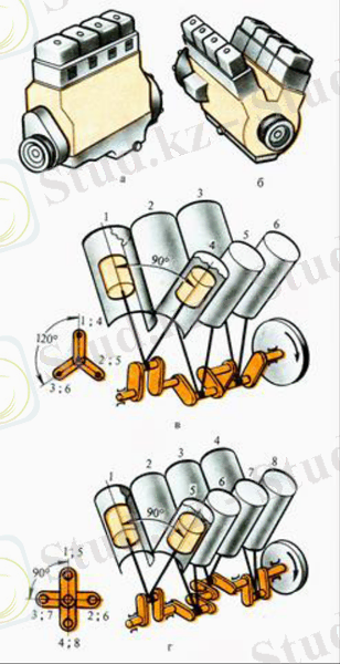 Сурет 1. 10 - Көп цилиндрлі қозғалтқыштар a - цилиндрлердің сызықты б -V-тəрізді орналасуы; в жəне г - алты жəне сегіз цилиндрлі V тəрізді қозғалтқыштардың иінді механизмдерінің диаграммалары; 1, 2, 3, 4, 5, 6, 7, 8 - цилиндр сандары